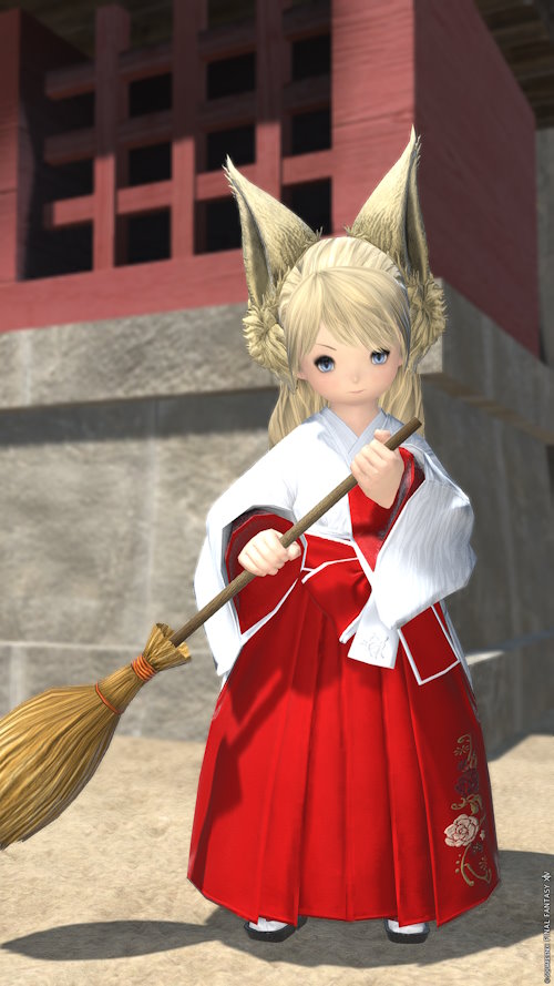 7.0後、ミラージュドレッサーの整理をしていたある日のこと。取ったはいいものの使いどころが無く、取得の面倒さ的に捨てるのもなかなか躊躇われるタマモカチューシャを眺めてさてどうしてくれようと考えた時、グリダニアエーテで見かけた巫女さんカラーリングを思い出して即決で狐巫女さんというコンセプトが決定した……のはいいものの、いざ実際に全部を装備したときにララフェルのとんがり耳が残って「耳4つは解釈違いでーす!!」という内なる心の声に従ってその場でウェアウルフセットも買った。結局タマモカチューシャは今日も使われることなくミラージュドレッサーの一角を占め続けている。本末転倒。