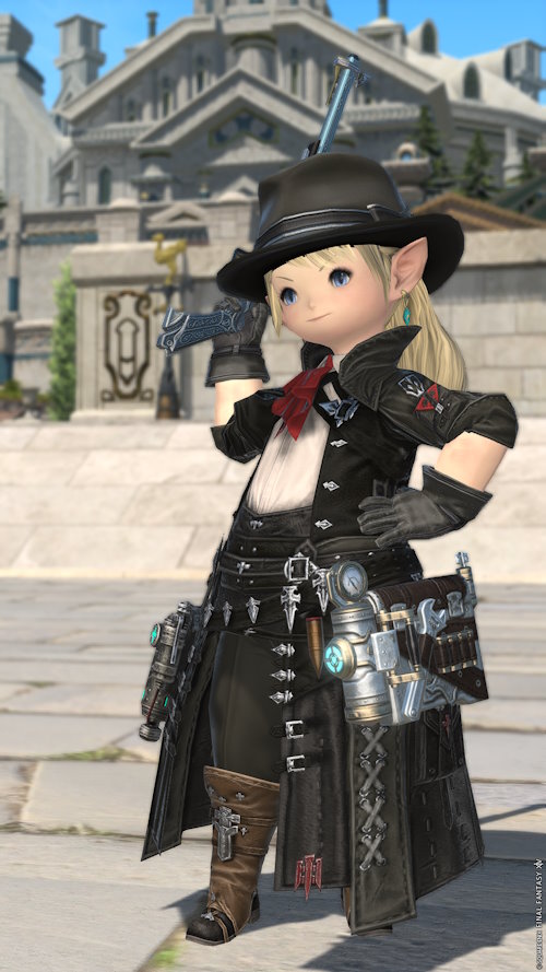 機工士を開放してすぐぐらいのタイミングで「荒野のガンマン」イメージで適当にハットを被らせたらやたら似合っていたので、今に至るまで装備を入れ替えつつ細身の銃+ハットの組を続けてきたもの。先代胴装備はステファニヴィアンとお揃いのをワインレッドに染めたやつ、先々代はお金がなくても無理なく買えたやつ。